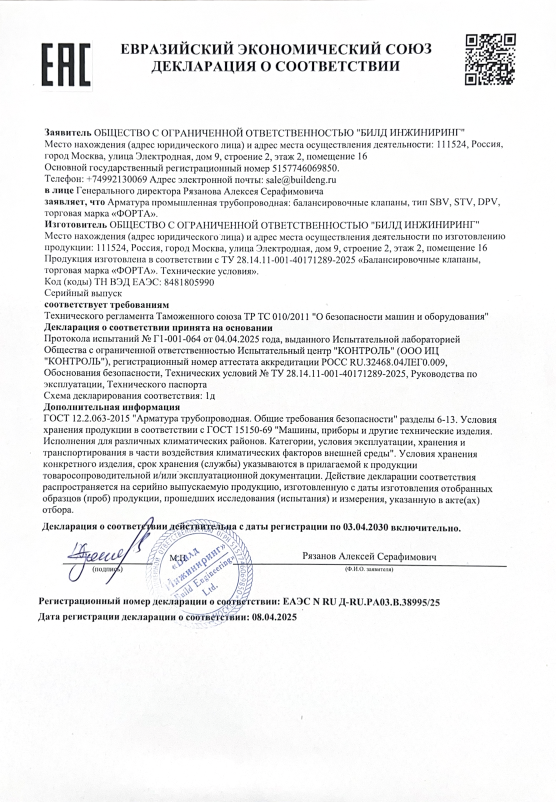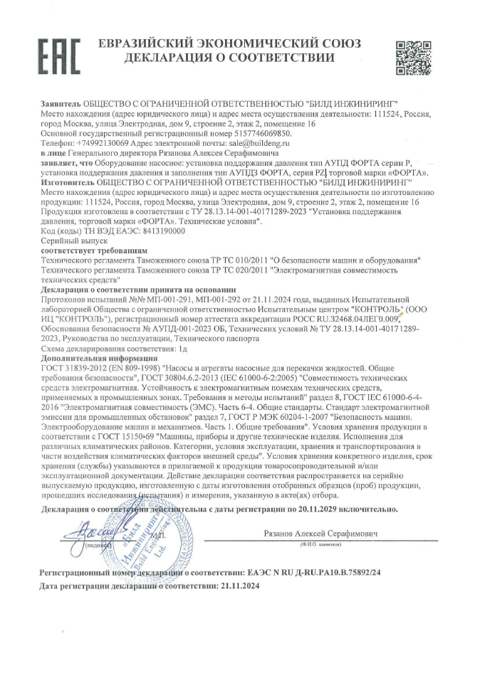Декларация о соответствии: установка поддержания давления тип АУПД ФОРТА серии Р, установка поддержания давления и заполнения тип АУПДЗ ФОРТА, серия PZ