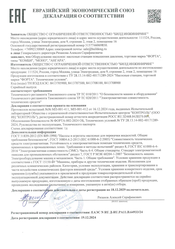 Декларация о соответствии: насосные станции повышения давления "КОМБИ", "МОНО", "АНГАРА"