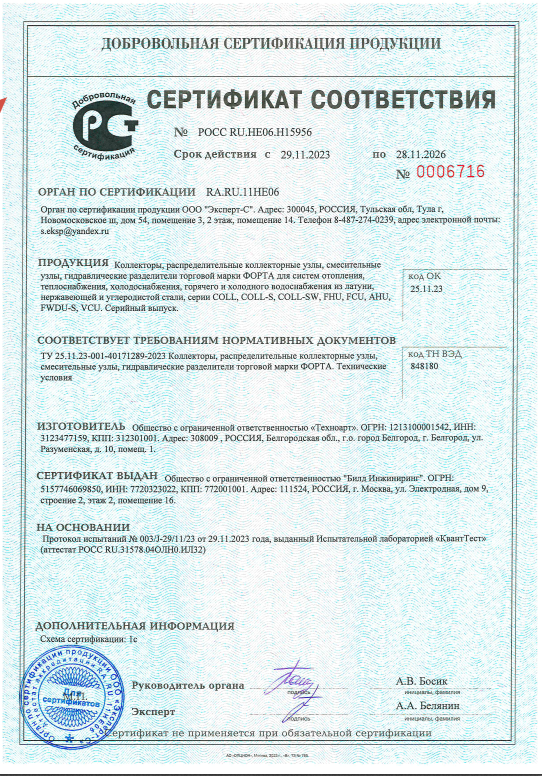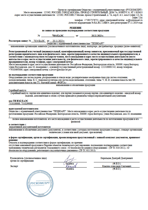 Решение по заявке на проведение подтверждения соответствия продукции: расширительные мембранные баки для систем отопления, холодоснабжения, типы: E, С; гидроаккумуляторы для систем водоснабжения, отопления, типы: V, H, D; основная ёмкость тип TP; дополнительная ёмкость тип TS