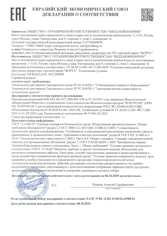 Декларация о соответствии: установки вакуумной дегазации, вакуумные деаэраторы тип VD