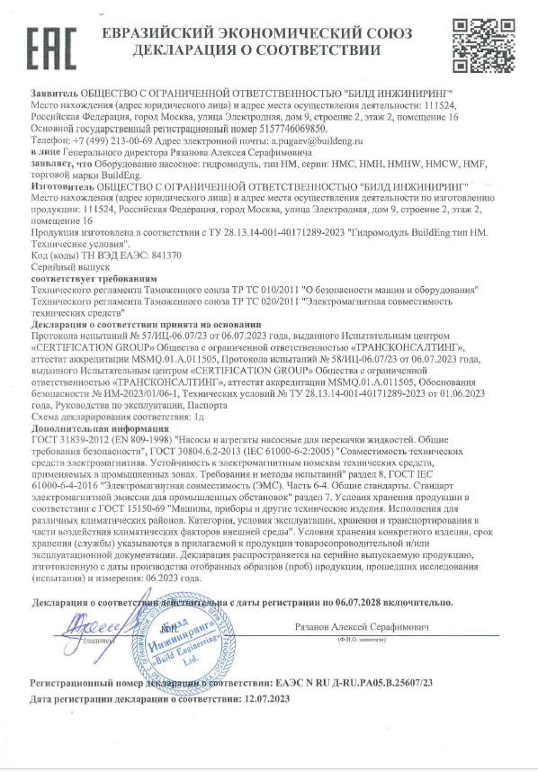 Декларация о соответствии: оборудование насосное: гидромодуль, тип НМ, серии: НМС, НМН, НМНW, НМСW, НМF