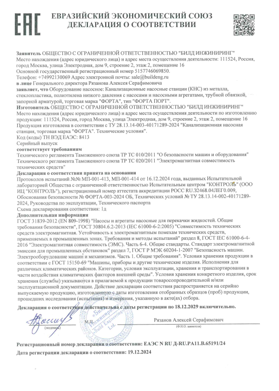 Декларация о соответствии: насосные станции (КНС) из металла, стеклопластика, полиэтилена низкого давления с насосами и насосными агрегатами, трубной обвязкой, запорной арматурой, тип "ФОРТА ПОРТ"